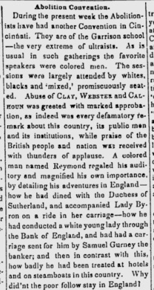 In 1853, black abolitionist CL Remond contrasted his abuse in the USA with his reception in the UK. A KY newspaper asked, "Why didn't the poor fellow stay in England?" "Love it or leave it" is one of the oldest plays in white supremacy's playbook. news.google.com/newspapers?nid=qdelZCX8GBYC&dat=18530423&printsec=frontpage&hl=en