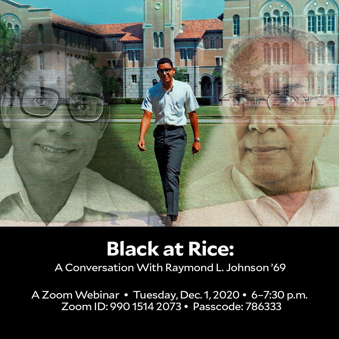 Webinar: TODAY at 6 p.m. Central, a "Black at Rice" conversation with Dr. Raymond L. Johnson, who in 1964 became one of the first African American students at