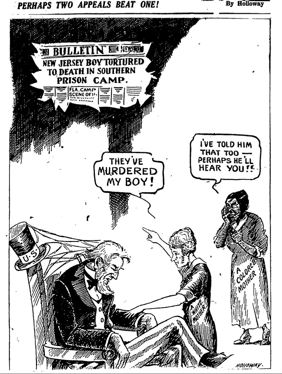 A 1932 political cartoon with white mom & black mom begging Uncle Sam for justice #BlackLivesMatter